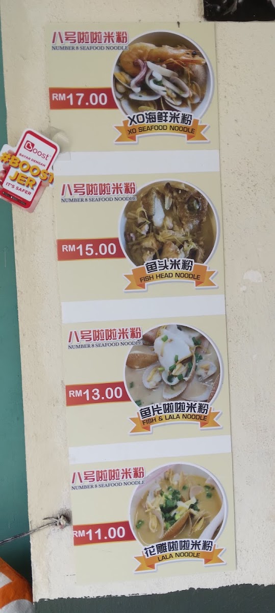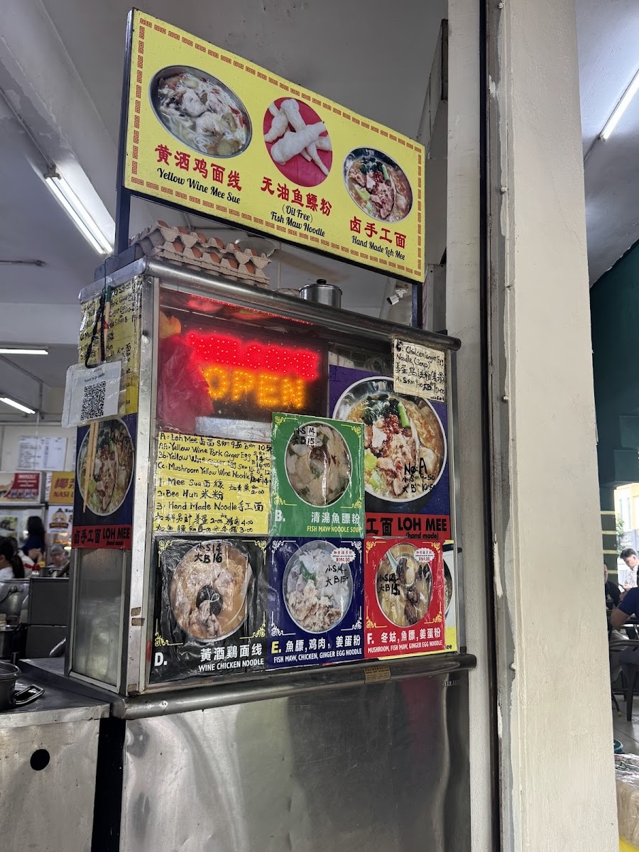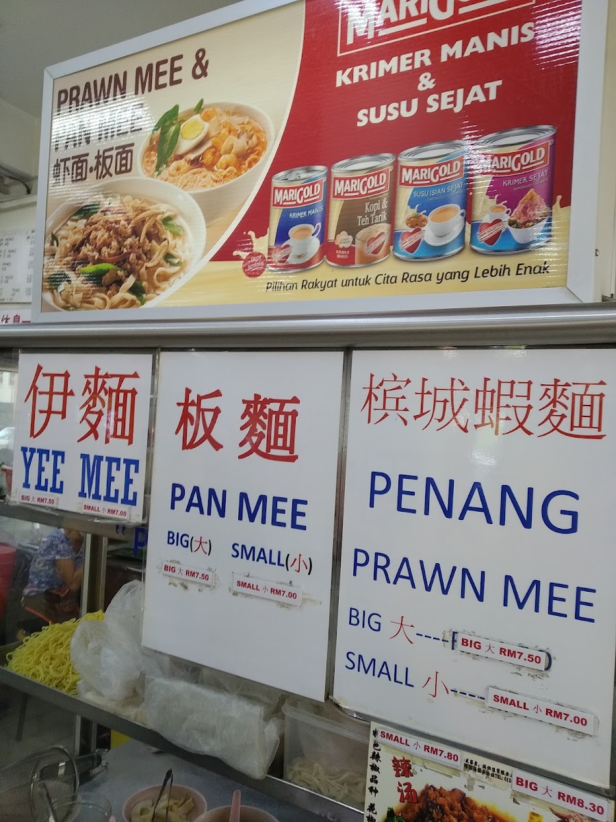 The food choices include several types of noodle soups such as Ipoh Hor Fun, Wonton Noodles, Fish Head Noodles, and Sarawak Kolo Mee, alongside classic rice dishes like Pork and Chicken Rice. Signature items include roast pork curry mee, curry laksa, and seafood noodles with XO sauce. There are also options for light bites and snacks such as popiah and various buns served with eggs.